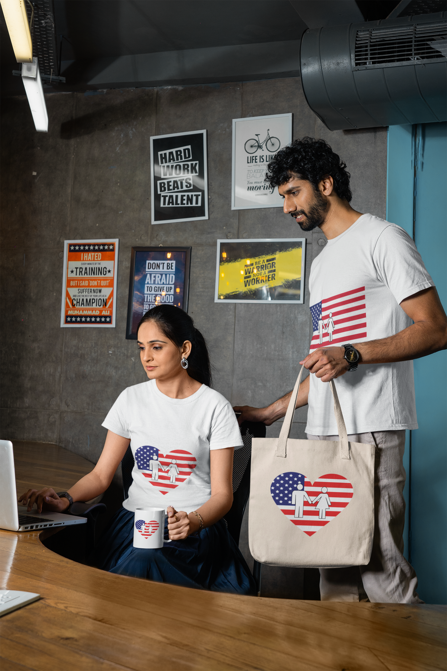 Our design displays the American flag behind the depiction of a husband and wife, a symbol of traditional marriage. The concept behind this design intends to honor the values of traditional marriage while celebrating the freedoms afforded to us in this country. We thank you for joining us on our journey and are proud to deliver our quality products to your door.
